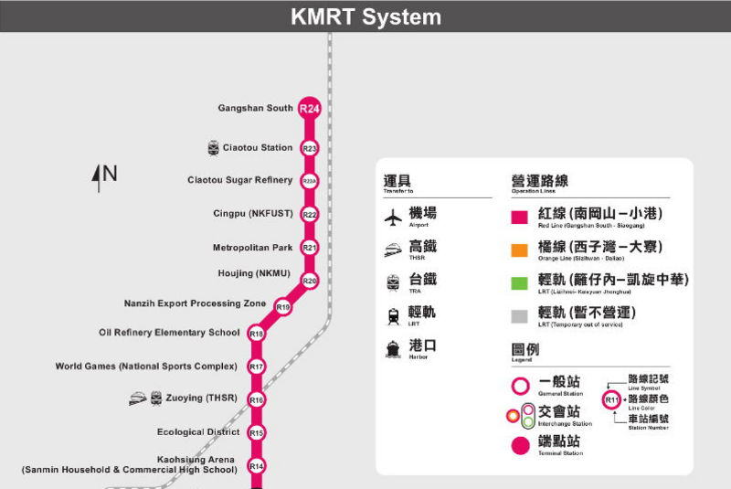 KMRT wird erweitert und bedeckt Teile des Kaohsiung Bezirks und Pingtung Bezirks. Momentane Linien werden weiter ausgebaut und andere Linien starten ihren Betrieb bald.