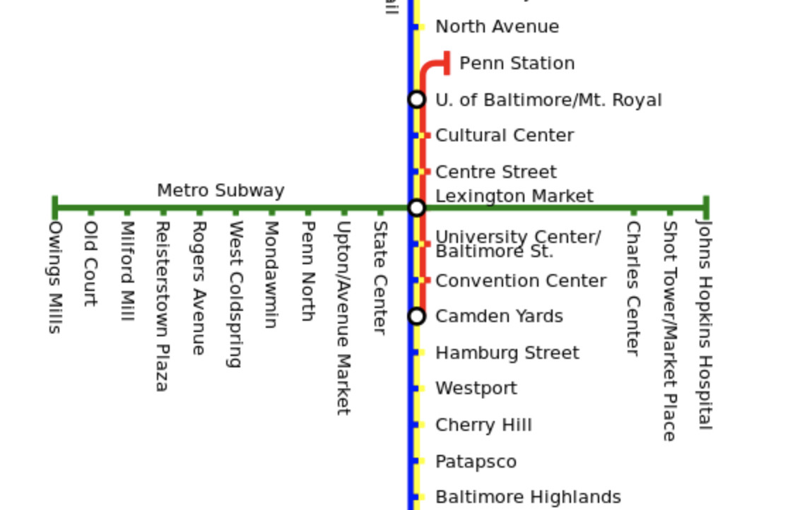 Stationen: Owings Mills, Old Court, Milford Mill, Reisterstown Plaza, Rogers Avenue, West Coldspring, Mondawmin, Penn-North, Upton/Avenue Market, State Center/Cultural Center, Lexington Market, Charles Center, Shot Tower/Market Place, Johns Hopkins Hospital