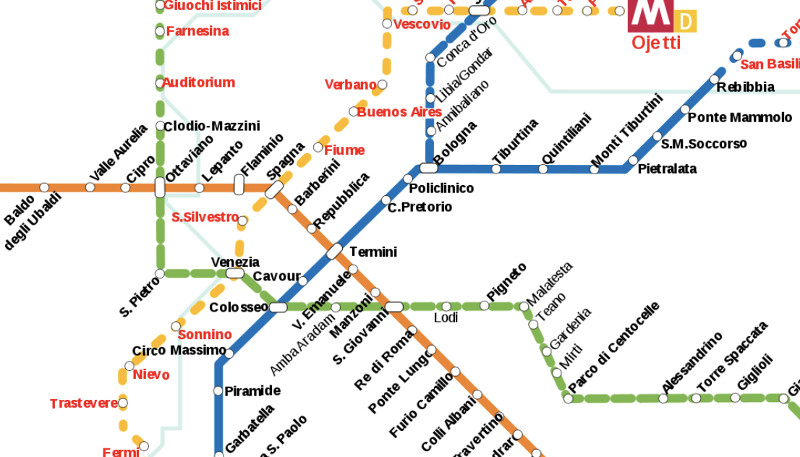 Battistini, Cornelia, Baldo degli Ubaldi, Valle Aurelia, Cipro-Musei Vaticani, Ottaviano-San Pietro, Lepanto, Flaminio-Piazza del Popolo, Spagna, Barberini – Fontana di Trevi, Repubblica-Teatro dell’Opera, Termini, Vittorio Emanuele, Manzoni, San Giovanni, Re di Roma, Ponte Lungo, Furio Camillo, Colli Albani-Parco Appia Antica, Arco di Travertino, Porta Furba-Quadraro, Numidio Quadrato, Lucio Sestio, Giulio Agricola, Subaugusta, Cinecittà y Anagnina.