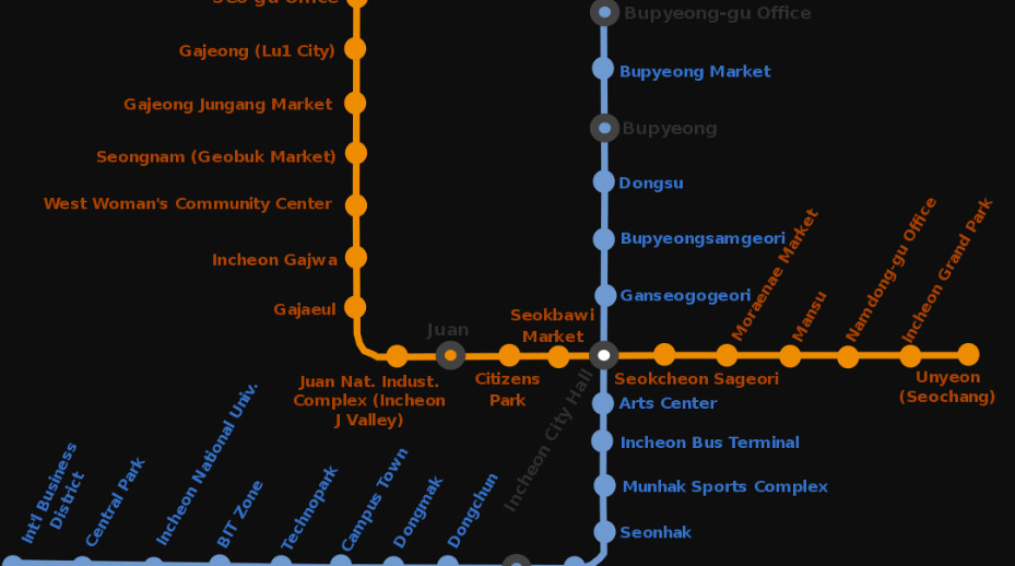 Incheon Transit Corporation (ITC) operates the Line 1. Four stations (Bupyeong-gu Office Station, Bupyeong, Gyeyang and Woninjae) on the line connect to the lines of Seoul system. Bupyeong is the busiest station on the line. A full metro journey takes around 55 minutes of time. Except between Backhon and Gyuhyeon, the line is mostly underground. The main stations on this line are
