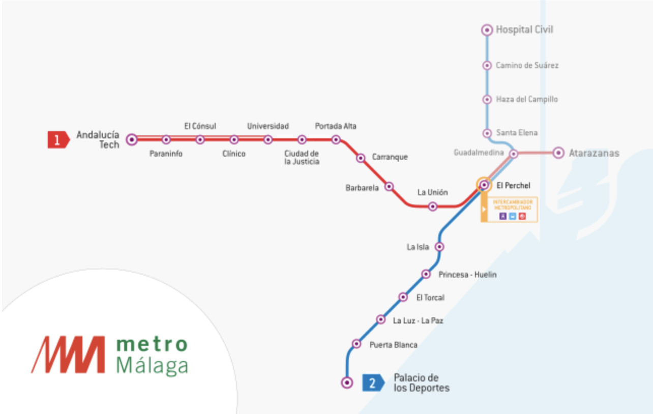 The 2 lines are interconnected at the station of El Perchel, which becomes the transport hub of the city, as from here you can access other transport systems, such as AVE (high speed train), suburban and regional train services of Renfe and intercity bus station.