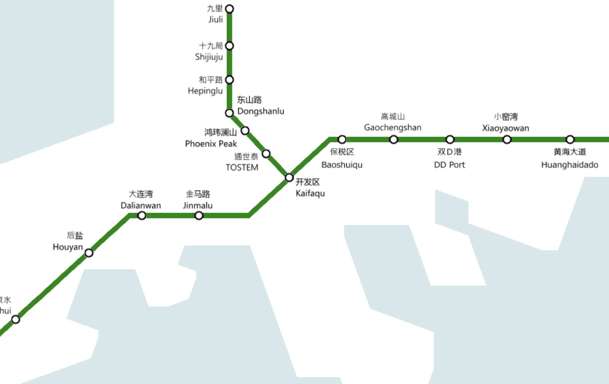 Leaving Hekou, this is the order of the stops: Dalian Railway Station, Xianglujiao, Jinjiajie, Quanshui, Houyan, Dalianwan, Jinmalu, Kaifaqu, Baoshuiqu, DD Port, Xiaoyaowan, Jinshitan, Tostem, Phoenix Peak, Dongshanlu, Hepinglu, Shijiuju, Jiuli.